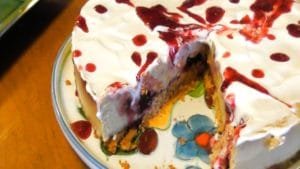 Another twist on a classic. A creamy peanut butter base and a raspberry jam swirl. Topped with a fluff frosting