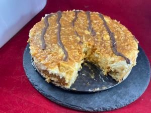 This is the Samoa cookie reinvented into a cheesecake. A Samoa cookie crust with a no bake cheesecake on top and more caramel and coconut mixed and strips of melted chocolate.