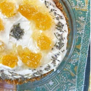 A no-bake cheesecake with lavender infused honey and ooey - gooey golden honey comb on top.