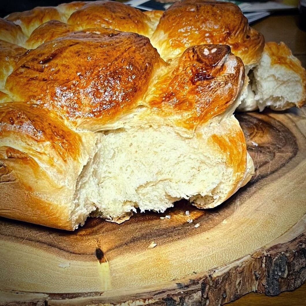 A fluffy and warm homemade, dinner roll/pull apart bread baked to golden brown perfection on top.