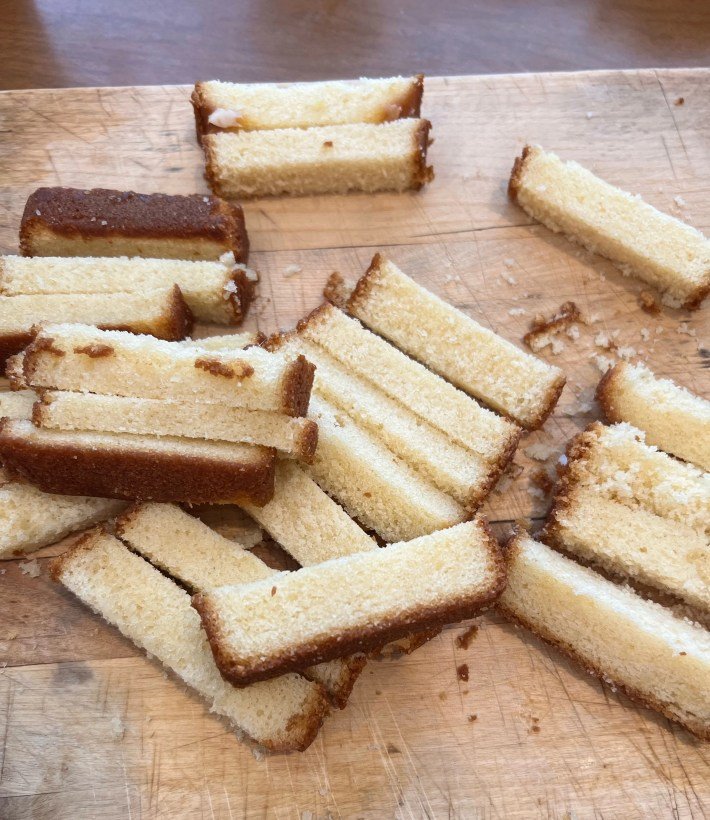 - Using a serrated knife, cut the loaf into 1 inch slices. Cut each slice into 1/2 inch sticks.