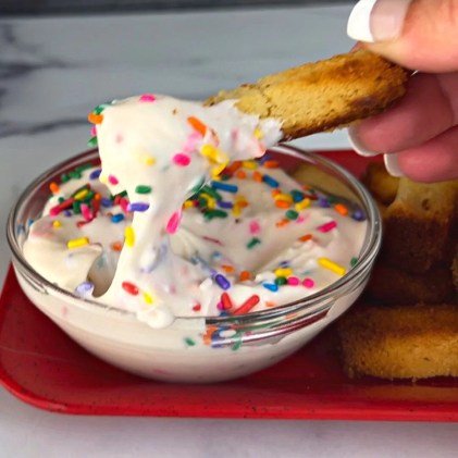 Fresh planks of pound cake that are crisped up in the air fryer or oven to a crunch consistancy pained with sweet confetti cake dip.