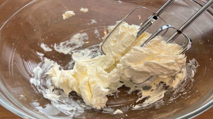 In my experience, both ways have a very similar result. If you do the process in 2 separate bowls the outcome is a tiny bit fluffier, but to me it’s not worth the extra mess. So I just do it all in one bowl. If it was a frosting, I recommend getting every bit of fluffiness that you can but this is a dip so you want a little bit looser of a texture in my opinion.