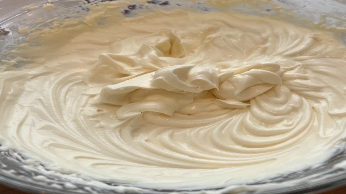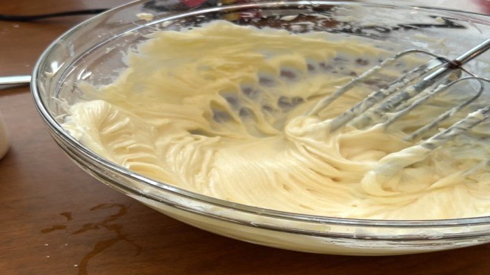 - Add in the heavy cream and beat until stiff peaks form.