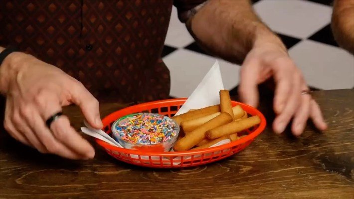 It was a little bit unclear to me what was used as a dip for these fries in Good Mythical Morning but Rhett said that it looked to be “frosting with sprinkles on top” to which one of the chefs of the show said “it’s not just frosting with sprinkles on top” but then didn’t elaborate so I went with confetti cake dip and this is how I made it.