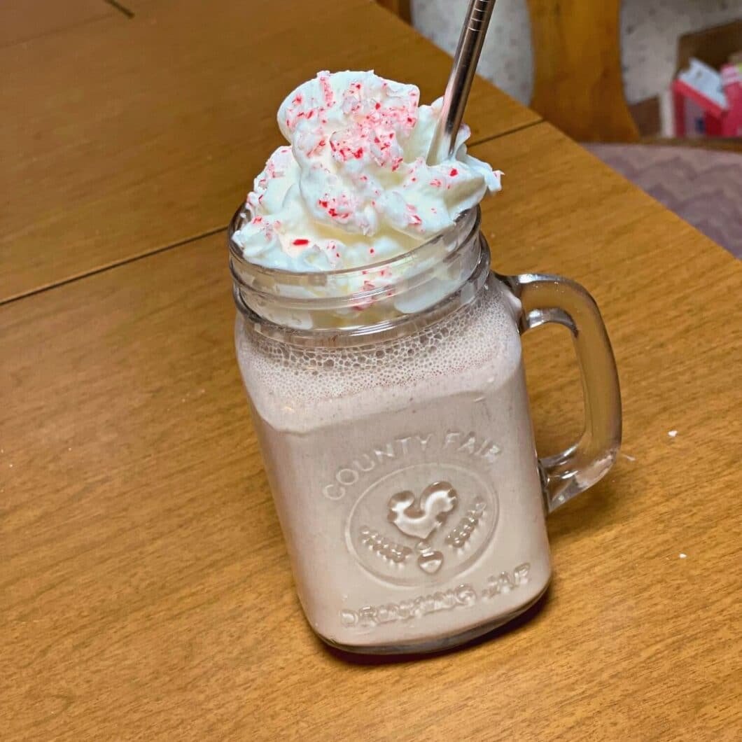 - Pour into a serving glass and top with whipped cream and the remaining crushed candy cane.