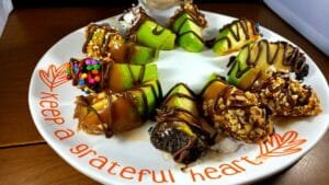 Green apple slices dipped in caramel and then rolled in various toppings.