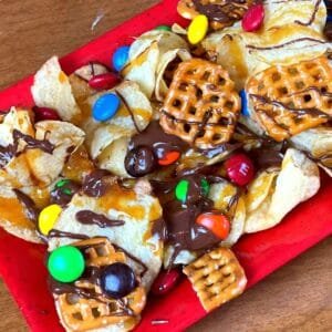 A sweet and salty version of nachos with potato chips and pretzels drizzled with caramel and chocolate and topped with M&M’s