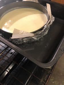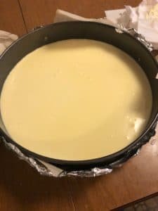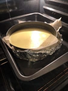 Prepare a water bath - Fill a pan that is big enough to fit the springform pan inside (I suggest a roasting pan) with water halfway up the sides of the springform pan. It doesn’t have to be boiling. I have noticed not much of a difference with hot or cold water so I just use cold because it is easier.