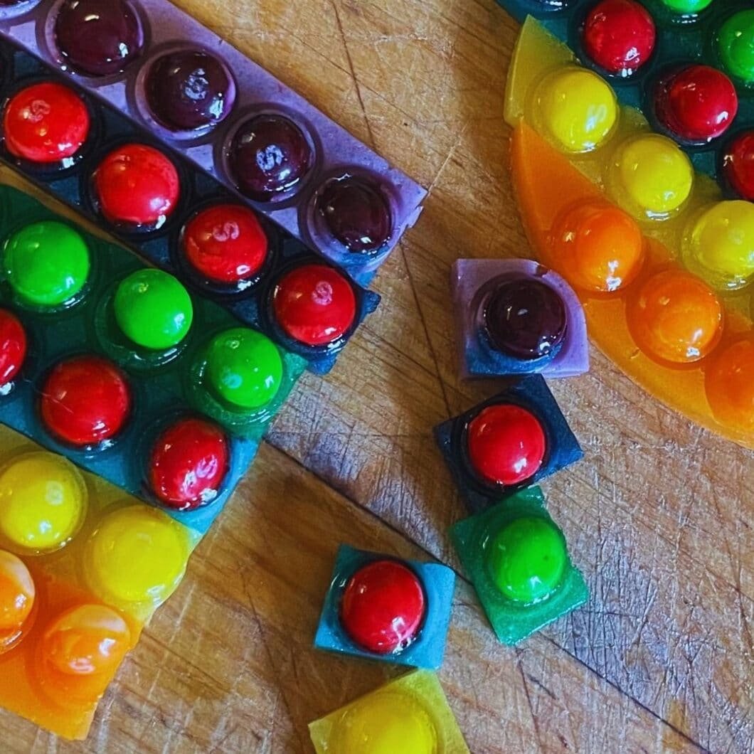 Hi everyone! This week I decided to take a new viral TikTok trend and give it a makeover. People are just simply taking a pop it fidget toy and using that as a mold to fill with M&M’s and melted chocolate to make a candy bar. I decided to take that idea and make it a little different. I decided to use skittles and a gummy solution.